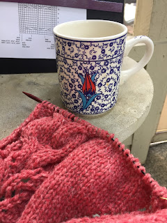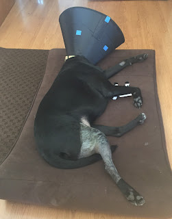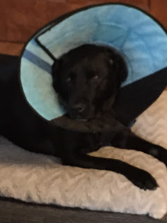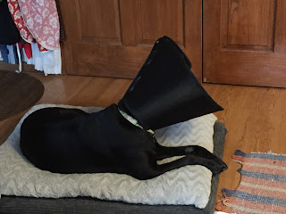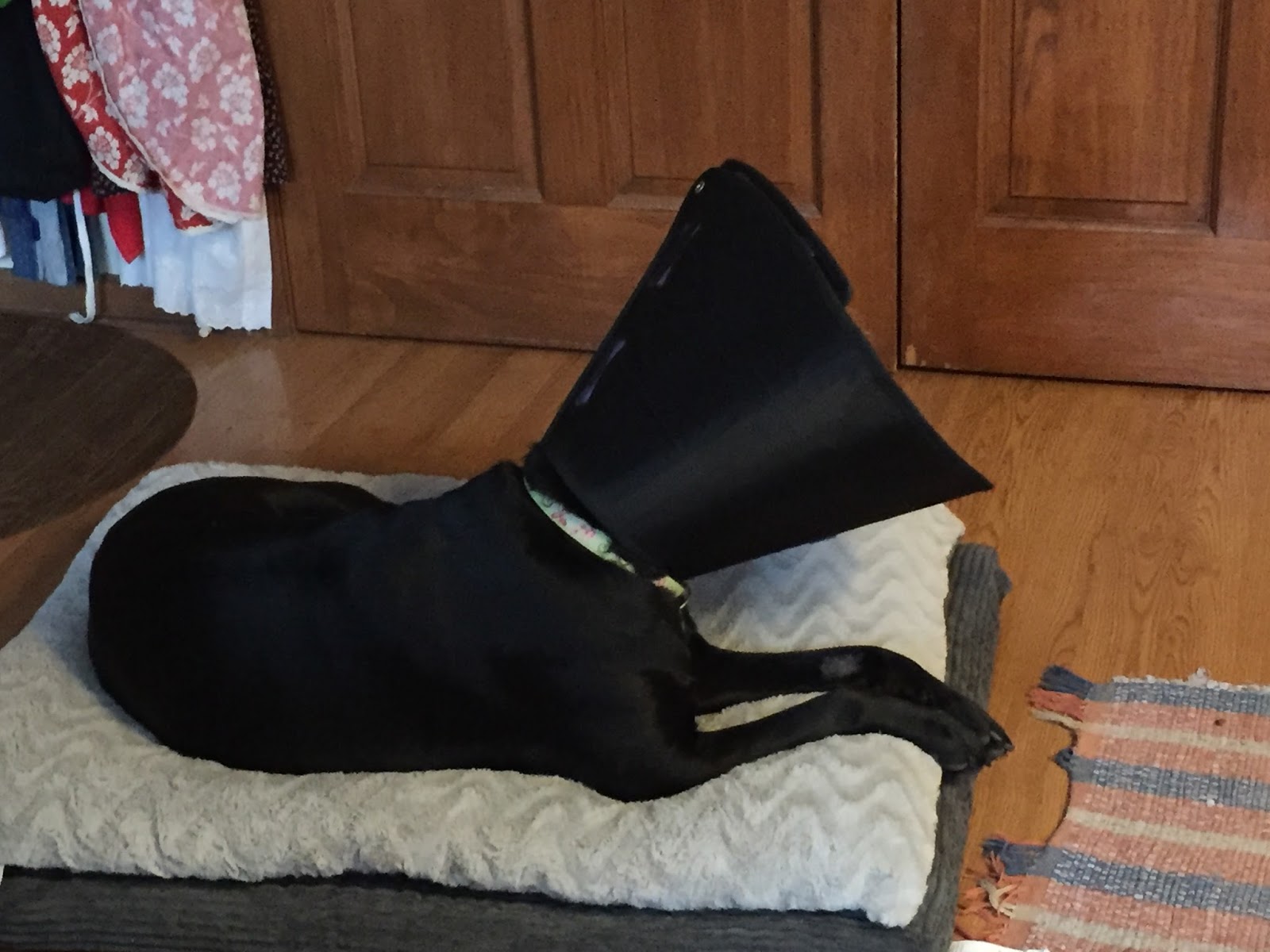 We had gates up through the house to keep her contained in the kitchen. No running, jumping or climbing for 6 weeks. And on leash for visits to the back yard. Rugs were purchased and strategically placed to keep her from slipping. It was all a bit nerve racking. But she bore the cone of shame with as much dignity as a black beast is able and was a good patient. I built a knitting nest for myself in the kitchen to spend as much time with her as I could.