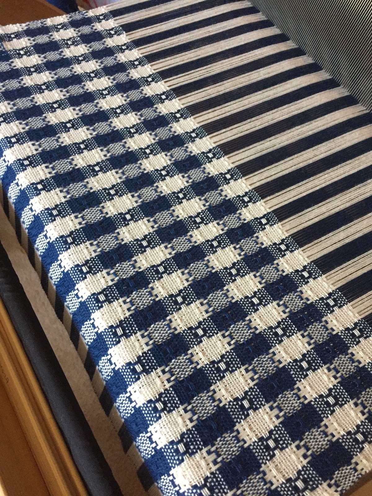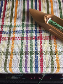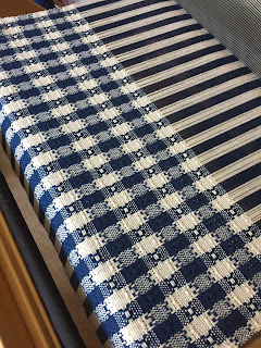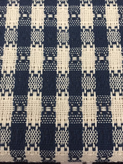 All that kitchen confinement restricted my time in Sweet Haven and Donna Reed (and blogging). I am making up for all that lost weaving time. I'd started a project in November- Before The Knee Event. I think that project was doomed from the start. I acted on an idea without doing all my homework- rushed through the process. Ordered fiber, then had to order more because I'd not even ordered enough for warp threads. Then dressing the loom had to happen in fits and starts when I could make time. Once Olive was free to use the stairs, we settled in to weave. I was attempting to weave some linen napkins. I realized pretty quickly that ThingsWereNotGoingWell. I stopped to consider whether to carry on or trust my gut- which was telling me (shouting actually) that the napkin was about to be a table runner. I modified the Pattern and wove what I hoped would be 4 lovely natural colored linen napkins. I ran out of warp at 3 napkins. They looked and felt like burlap. Stiff, bullet proof burlap. Discouraged, but not willing to "throw in the towel"-haha- I threw them into the washing machine, hoping that a softening miracle would happen. Wrong. I threw them away and began questioning why I even have a loom. I let the wrong combination of project and fiber get to me. I won't let myself consider the time and money wasted. Lesson learned. I've successfully woven napkins in the past and will do so again.